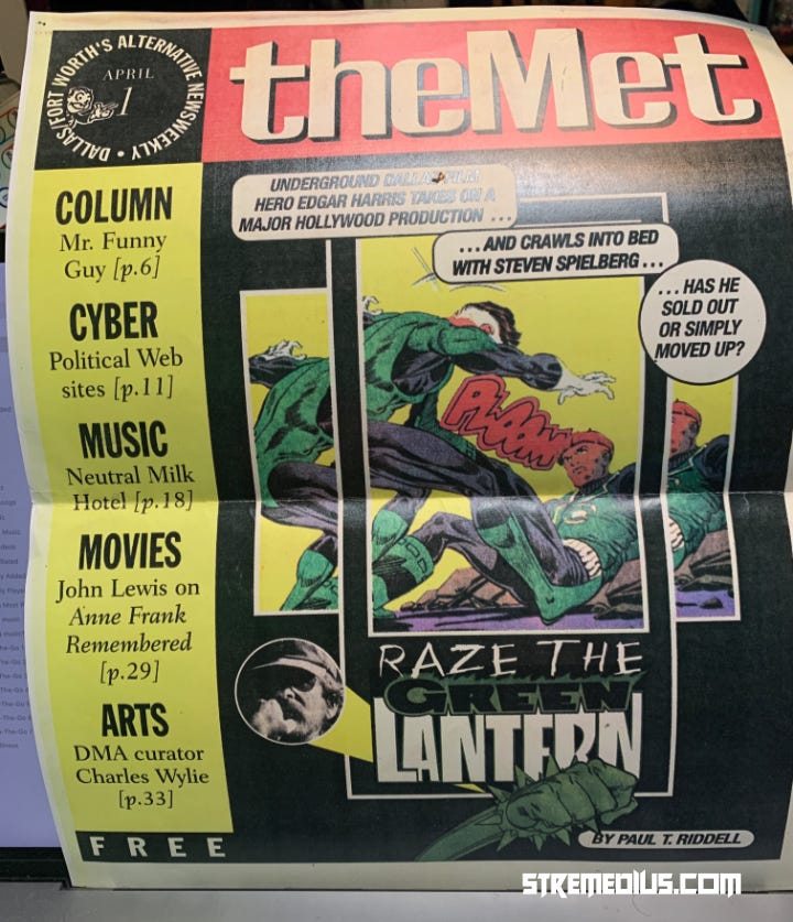 Don’t cry for me, dear reader. Mentally rewinding the clock and surmising what would have happened if I hadn’t been stuck on a groundskeeping job that paid enough for rent or food but not both, you, I, and everybody else wouldn’t have liked the person I would have become. (Not that you particularly like me now, but at least you’re honest.) As it was, desperate destitution led me to ransack the local library, giving me exposure to a whole load of resources and reading materials I wouldn’t have had exposure to before. Since I couldn’t convince people I knew pre-move to get away from their computers and do anything, I hopped on my bike and tore around everywhere, eventually exploring everything from north Carrollton to downtown because I had nowhere else I had to be. A chance encounter exposed me to Dallas’s community radio station KNON, and I biked into downtown to ride in a parade protesting the First Baptist Church of Dallas attempting to steal KNON’s frequency for itself. (It was the best sort of protest parade: everyone expected 100 participants, we got over 5000, and the news coverage got FBoD to negotiate to switch frequencies with its own radio station.) Best of all, because of that whole “butts in front of the computer” thing, I gave up on calling cohorts and went off to visit local record shops and ephemera stores, where I came across that most wonderful of mid-1980s weirdness, the “zine.” If this were a James Burke special, this would be where he pops up to note the turning moment where life completely changed, arguably for the better.